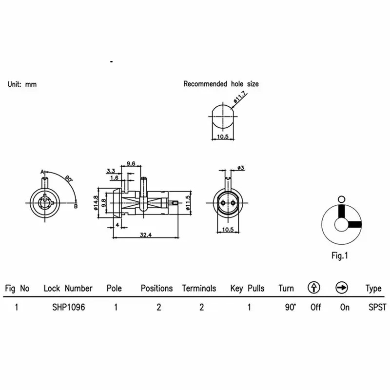 2支圆端子脚与接点镀银,电讯OFF-ON,迴路型态SPST(单刀单掷),即12点不通电,3点通电,钥匙转向12-3,钥匙可于12点及3点位置拔出,可依客户需求增加加工工序,如:焊线.....等等。锁头用插片安装固定。接点容量:0.2A 125VAC,寿命测试通过6000次,符合ROHS与REACH,适用于复印机、仪器设备。